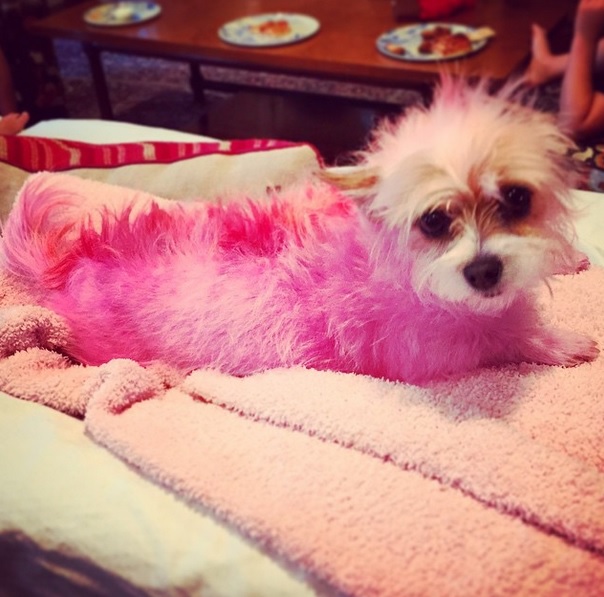 Tori Spelling: “Someone wanted in on the #Easter egg dying! #Mitzi#DIYDoggieDye #PinkPooch #allnatural