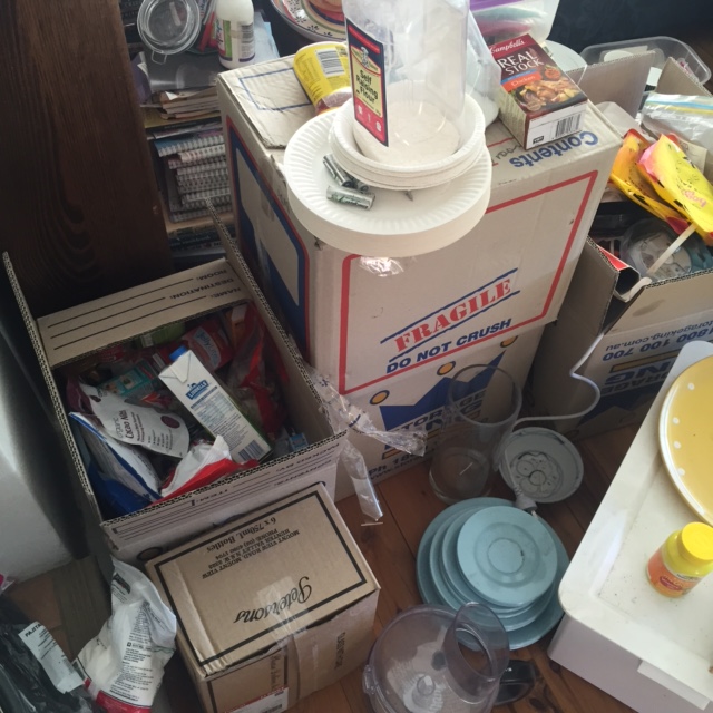 The contents of the kitchen remain scatttered – and dusty – across the back room because the pantry cupboard still doesn’t have handles or shelves. I could possibly do the shelves myself but … no time.