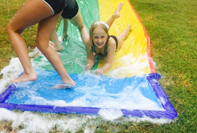 I was working from home yesterday, so I invited her skipping team over after their holiday practice session to take the Slip N Slide for a spin. It was supposed to be an “OK guys, have fun, don’t bother me for an hour or so” exercise, but it turned into a bit of a palaver as I didn’t have the right attachment for the hose to hook up to the Slip N Slide.