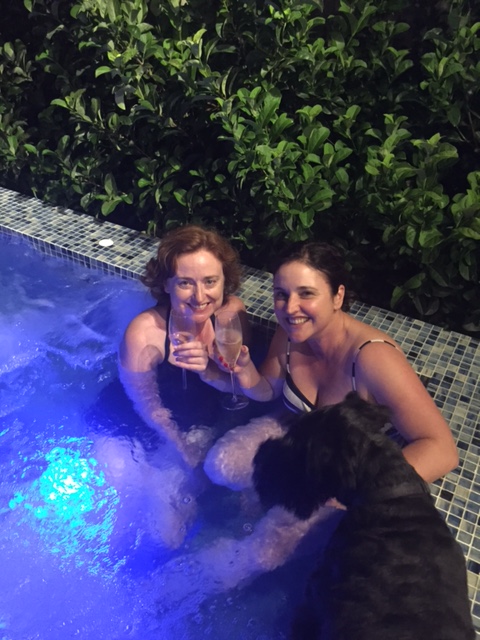 I accepted her afternoon Prosecco and raised her a dinner. After heading to Pump class – I couldn’t do my regular 8am class because I needed to see the kids off on their week of skiiing – I took a dish of Ma Po Do Fu to her place, then we sat in her spa and swore a lot while drinking Brown Bros finest.