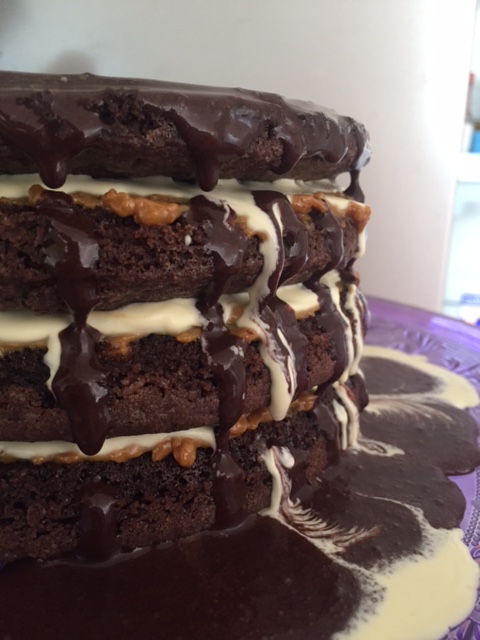 The eldest had requested a brownie layer cake with fresh cream and caramel, then drizzled with chocolate icing. I’m a bit of a newbie with cream, so I daftly bought double cream, which immediately liquified and ran in rivulets down the sides of the cake. I told myself it looked artistic …
