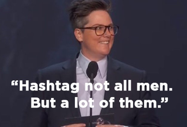 “Just jokes, fellas, calm down. Hashtag ‘not all men.’ But a lot of ‘em. Nobody knows what jokes are, but especially men. Am I right fellas? That’s why I’m presenting alone,” she said.