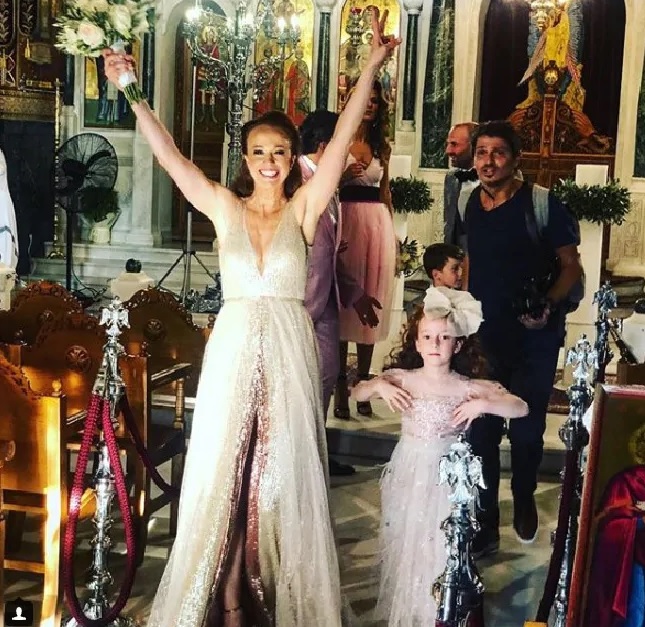 An Instagram photo (below) showed Natalie in a stunning, champagne gown with a plunging neckline with her daughter Michaela, 5, by her side. In the background, Calombaris could be seen wearing a suit by the altar.