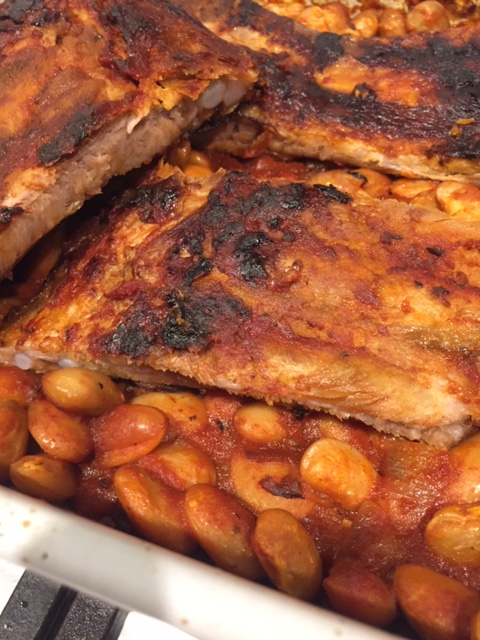 Bake ribs for 30 minutes, turn and bake another 30 minutes. Remove ribs carefully to avoid first-degree burns and cover with foil. Tip drained beans into the baking dish and pour over the rest of the passata and the 250ml of the apple cider (drink the rest).