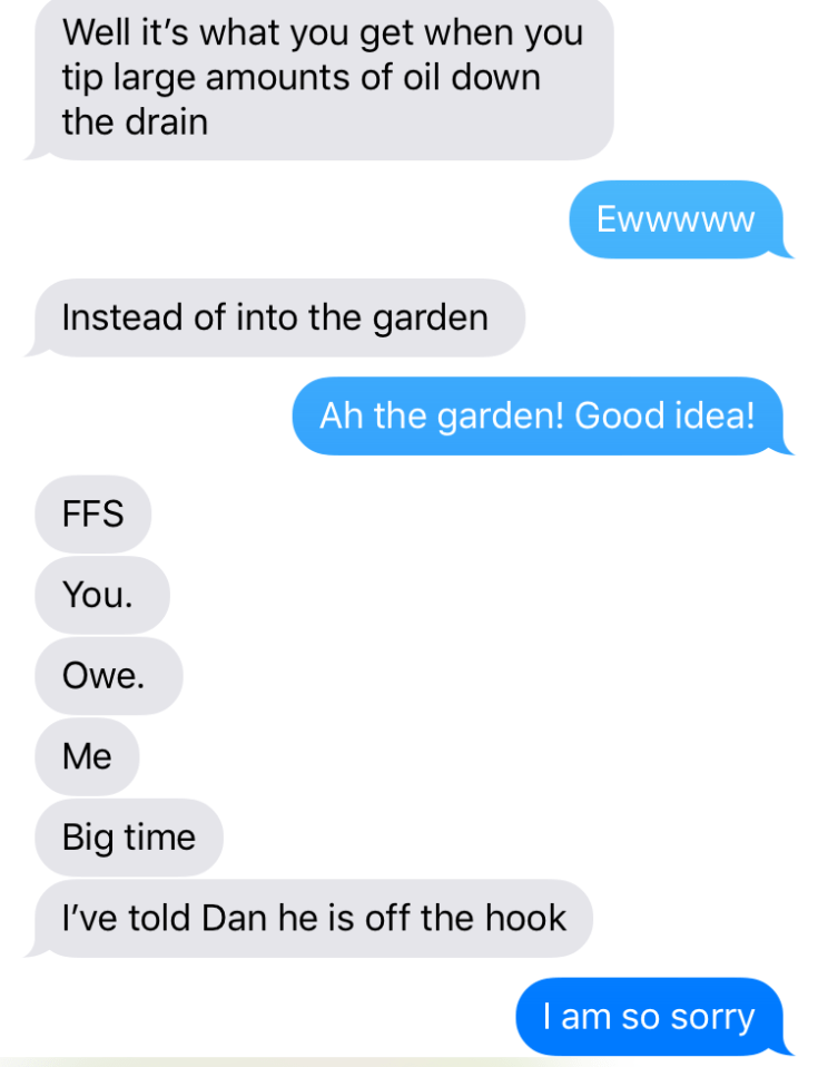 But my heart sank when I got a message mid-meeting that said: “So, how do you normally get rid of cooking fat and oil.”