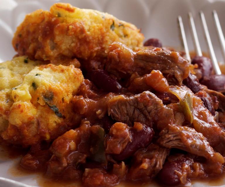RECIPE: Slow-cooked chilli beef with cheesy cornbread dumplings