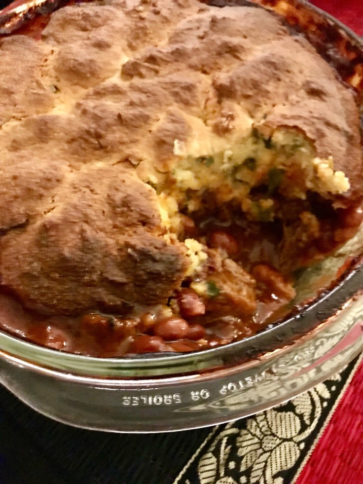 It’s a variation on a slow-cooked Mexican beef dish I’ve posted previously, but I’ve pimped it up with chipotles in adobo sauce and cheesy cornbread dumplings.