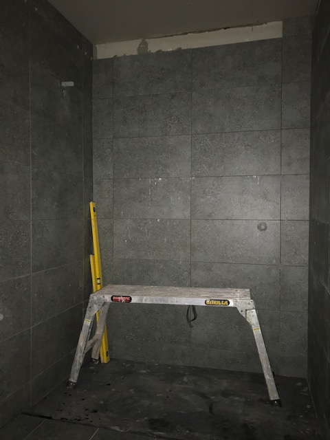 I have no idea how he affords going away if he’s paid by the job rather than the hour. And I’m presuming that’s how it works, otherwise the builder would be going nuts by now. Not that I’m an expert – maybe this is how long it takes to tile small rooms.