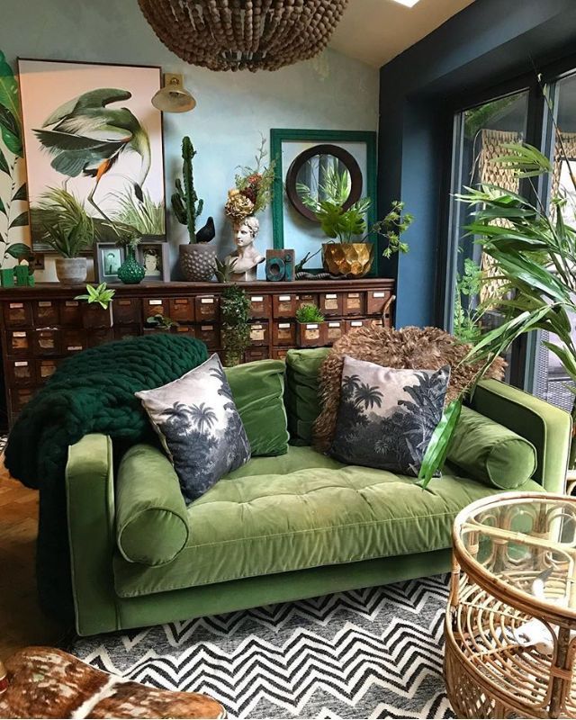 I feel an almost painful desire to have the green velvet couch and match it with some rattan coffee tables and plants I’ll invariably kill.