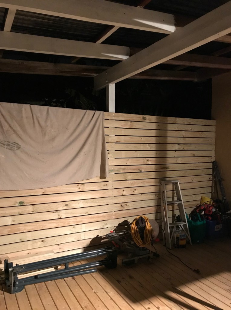 While he sawed and drilled, I painted the rafters. Well, I painted about half of them. There are soooooooo many and it’s looking like they’ll need about three coats because the wood is soaking up the paint like nobody’s business.