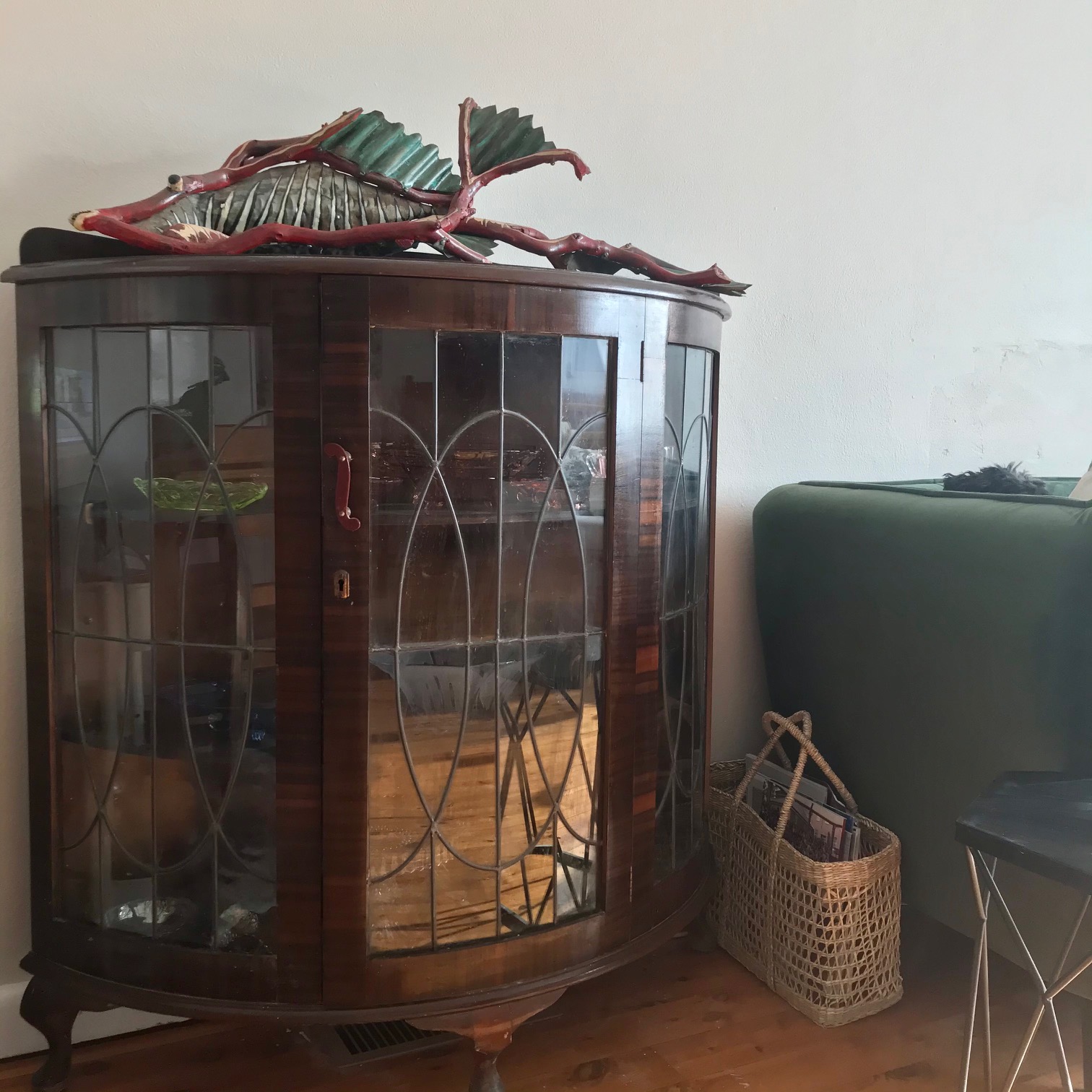 In the meantime, I am trying to make the place look stylish, without spending any money. My grandmother’s old leadlight cabinet was dusted off yesterday and positioned next to the velvet sofa.