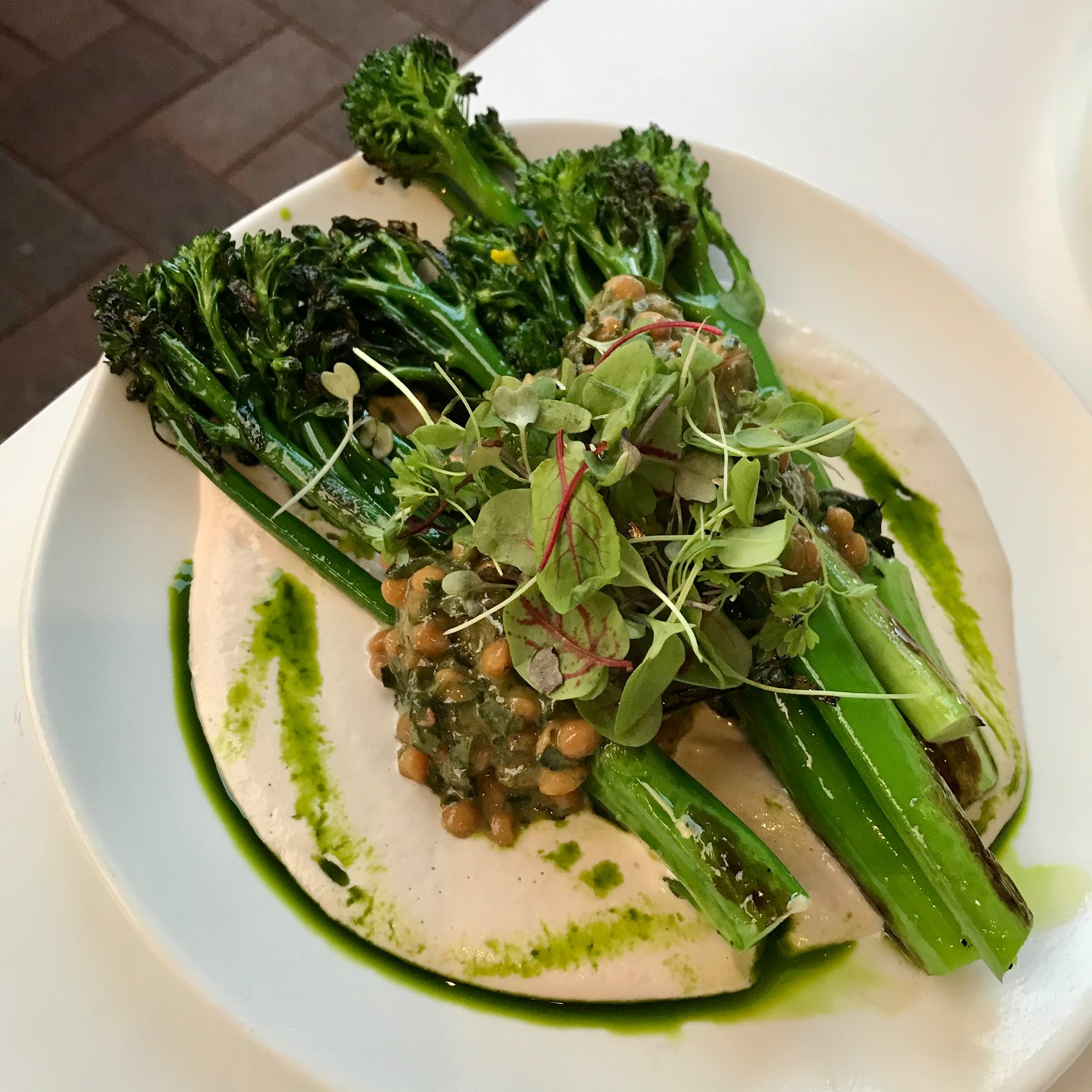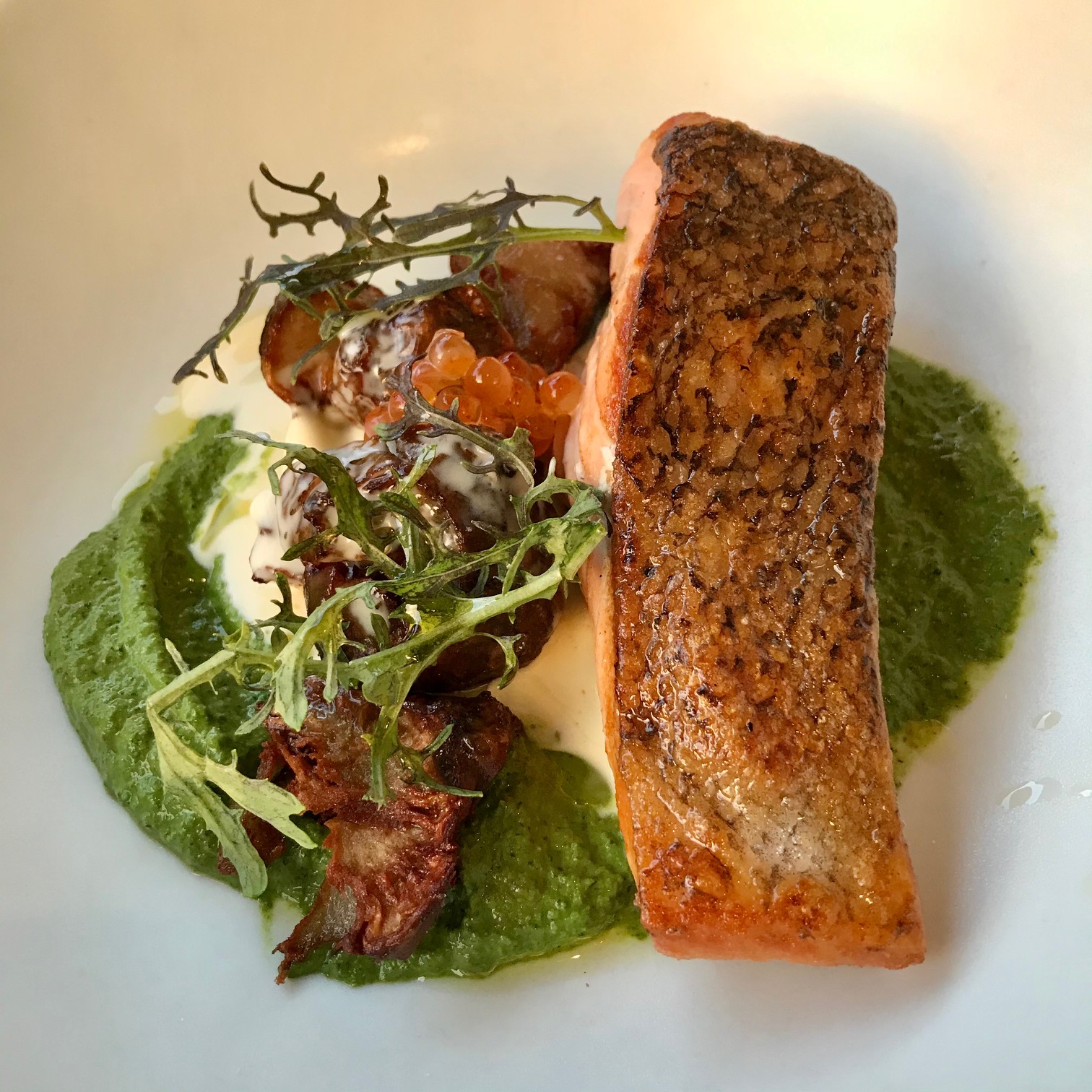 On this occasion, we shared half a dozen Sydney Rock oysters with dashi, soy, chive and roe; then DD had a steak and I had the Tasmania salmon with salsa verde, fried Jerusalem artichokes, creme fraiche and salmon roe; with the most delicious side of roast broccolini, mint, lentil dressing and smoked cashew.
