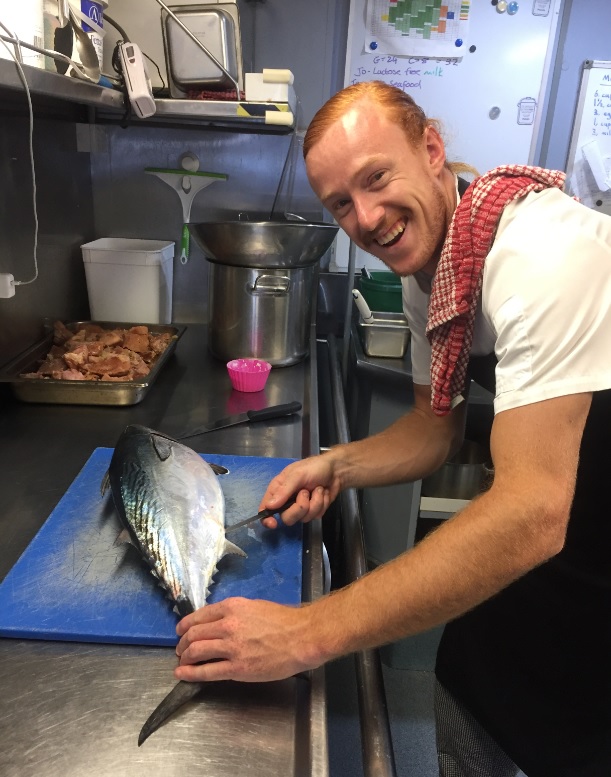 We return to the Reef Prince for morning tea and chef Jayden motions for me to come over to the bar. He asks if my husband wants to watch him fillet a fish in the galley. I decide not to bother telling him DD is just my boyfriend. DD had mentioned to Jayden the day before that he was keen to see the master at work and the ginger-haired food ninja – who previously worked at a hatted-restaurant on the NSW South Coast – was happy to oblige.