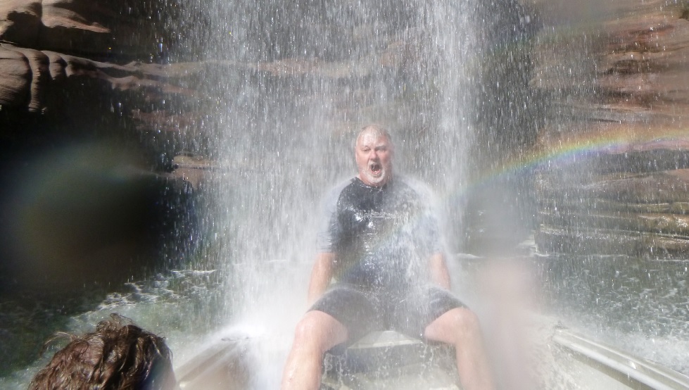 DD opts for a turn under the faster plummeting falls and I take a series of snaps as he is violently doused with water. We laugh at his shocked face as the water plunges over him.