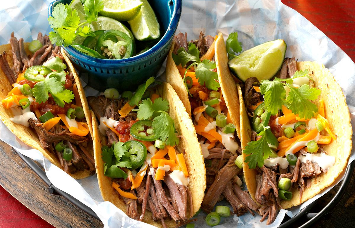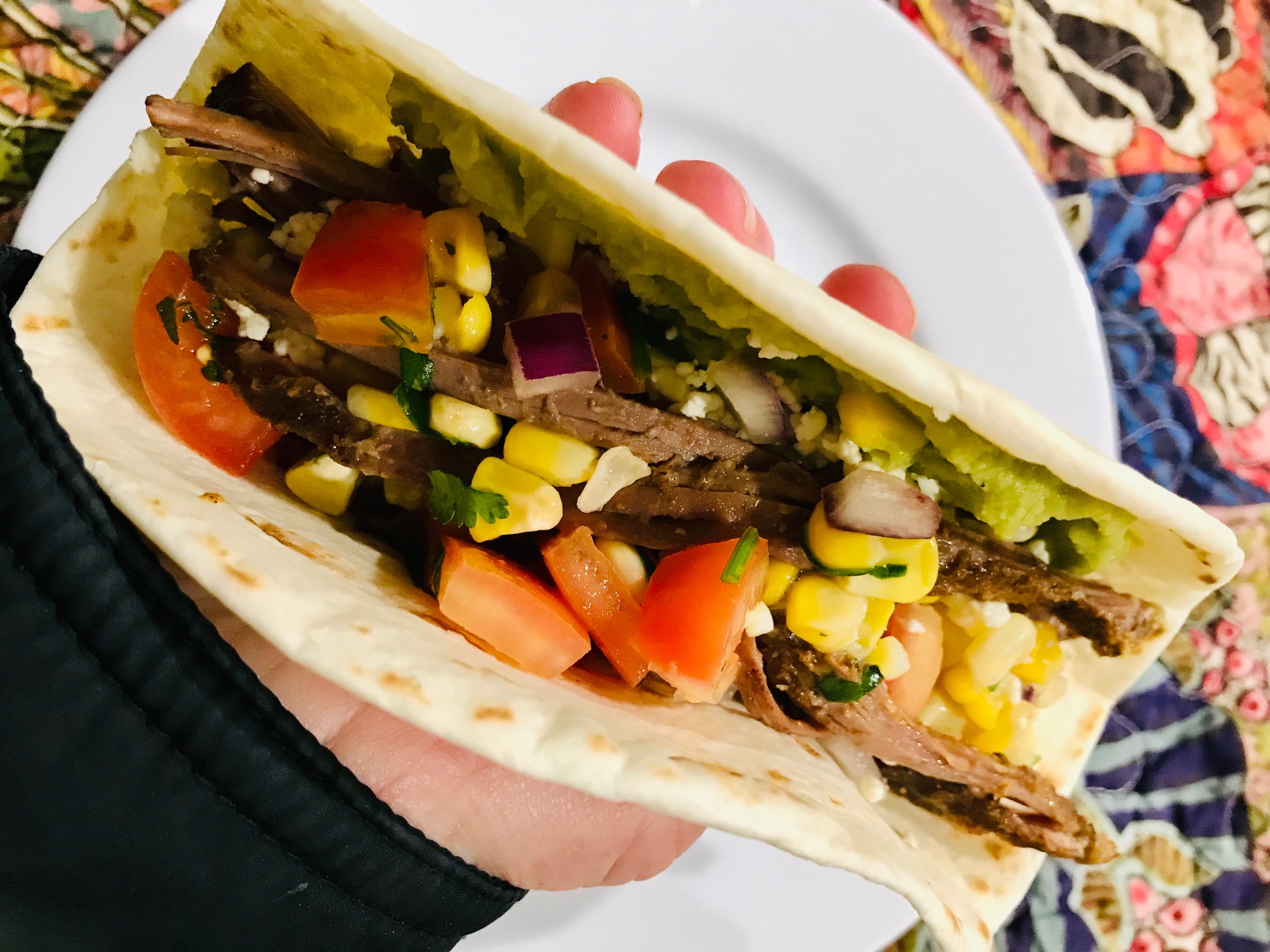 Place beef brisket, corn salsa, crumbled feta, hot sauce and guacamole with soft tacos on the table and let everyone help themselves.