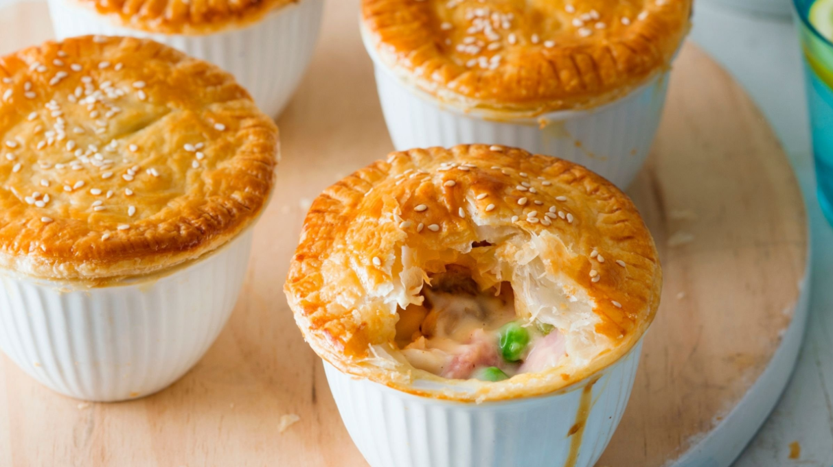 METHOD: Place chicken in a large pot and cover with water. Add celery, carrot, onion, garlic. Bring to a gentle boil and let simmer until chicken is cooked. Remove chicken from stock and pour liquid through a sieve to remove the veggies etc, add salt and pepper to taste. When chicken cools, strip the meat from the carcass. Dice the chicken breast meat for the pies and use the rest for another dish. Melt a tablespoon of butter in a pan and saute onion and bacon until softened. Add celery and carrot and saute until softened. Add frozen peas and corn and two cups of the chicken stock. Simmer for a few minutes. Stir through the cooking cream. Mix 1 tablespoon of cornflour with a little warm water to form a paste. Add to the simmering creamy mixture to thicken it. Stir through the diced chicken. Salt & pepper to taste. Divide mixture among ramekins. Cut pastry into quarters (or circles if you’re feeling fancy). Place on top of the ramekins and brush with beaten egg. Bake in oven at 180C until crisp and golden. Serve with mash if you like.