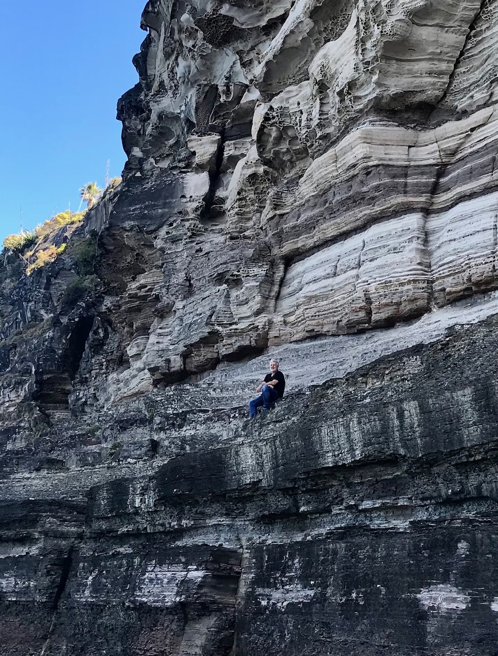 The speck below is DD sitting halfway up the cliff face, waiting for me while I explored the rock pools.