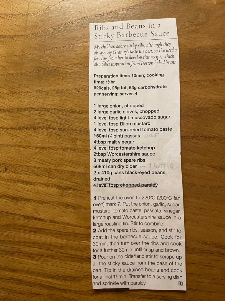 DD even rescued the dinner from disaster. I took an ancient magazine clipping to his place the other week to make the dish and couldn’t find it yesterday. Fortuitously, he’d taken a photo of it!