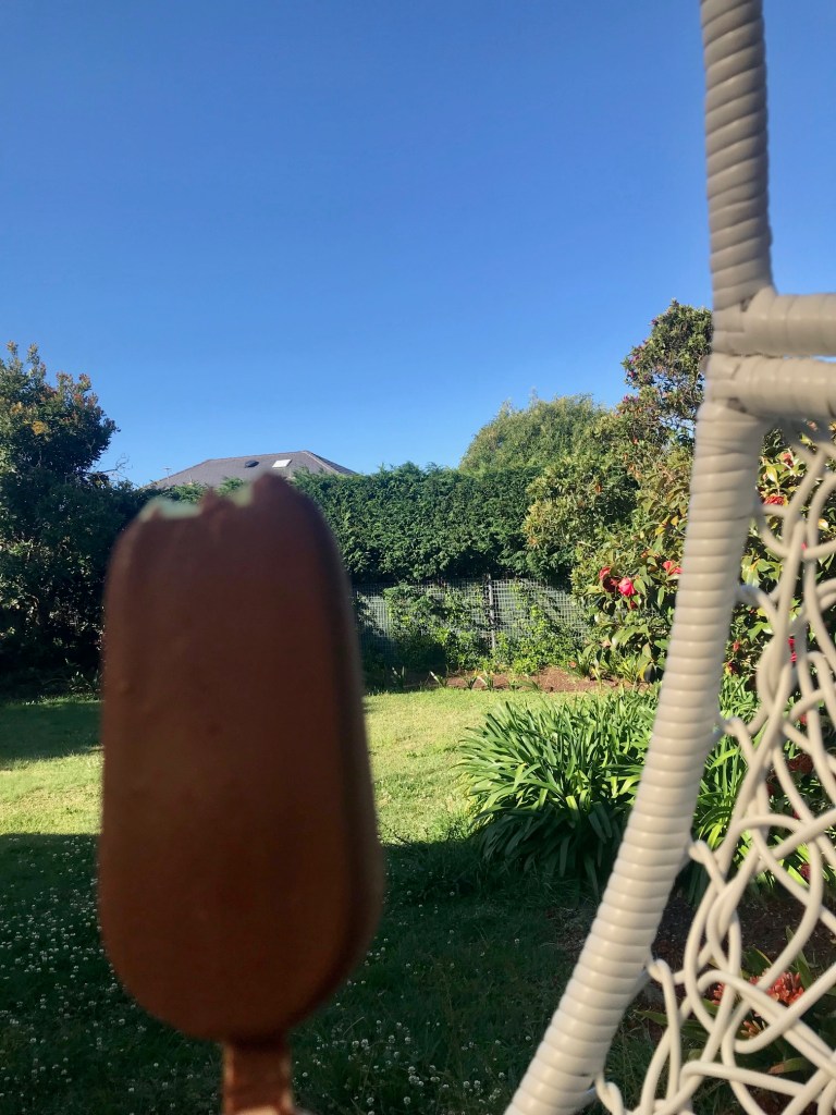 In the meantime, I’ve been testing out the new hanging egg chair. It matches well with a mint Magnum after a freaking intense day of Zooms, writing stories and editing hundreds of “ths” and “nds” out of a military-themed website I created for a client.