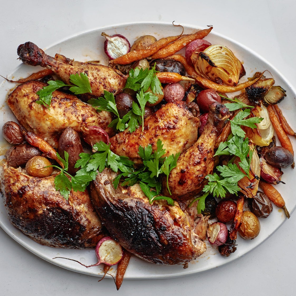 Remove chicken from oven and drain off juices. Add vinegar and some of the goat’s cheese olive oil. Pour over veggies. Scatter a few cubes of crumbled marinated cheese over the veggies. Sprinkle with fresh herbs and arrange chicken on top. Serve.
