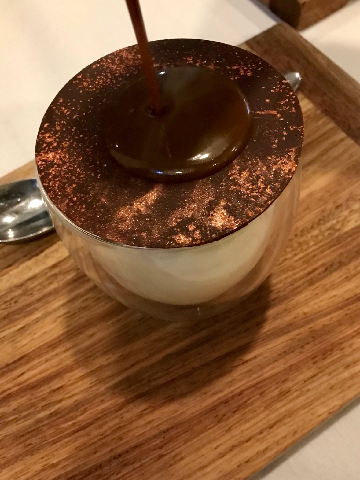 There were two desserts – peanut ice cream with a tuile, followed by a theatrical tiramisu inspired dish with a chocolate lid that was melted with a hot coffee sauce to reveal the delicious contents below.