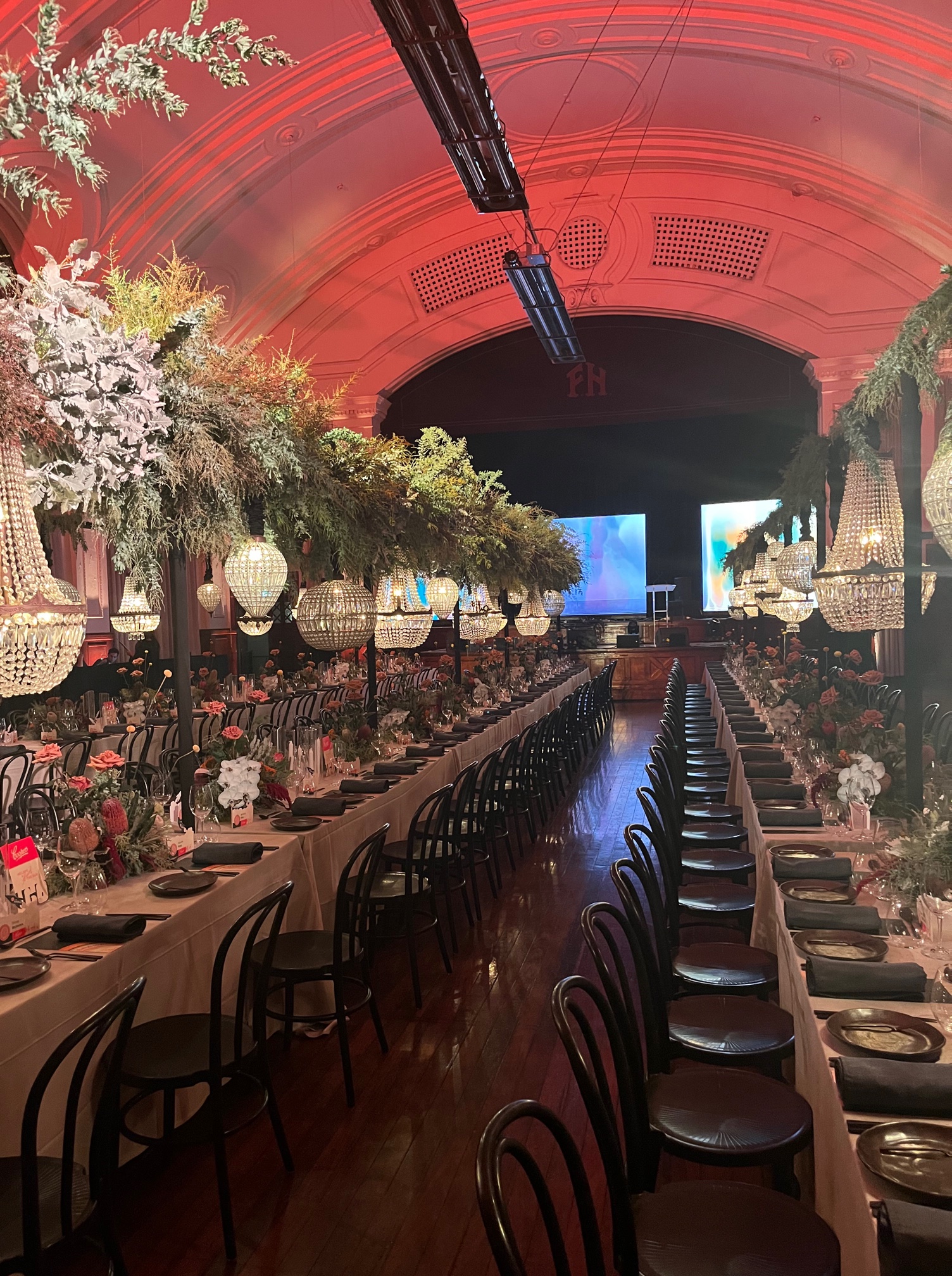 After pre-dinner drinks we moved into the ballroom, which had been styled with three super long tables festooned with chandeliers and more foliage.