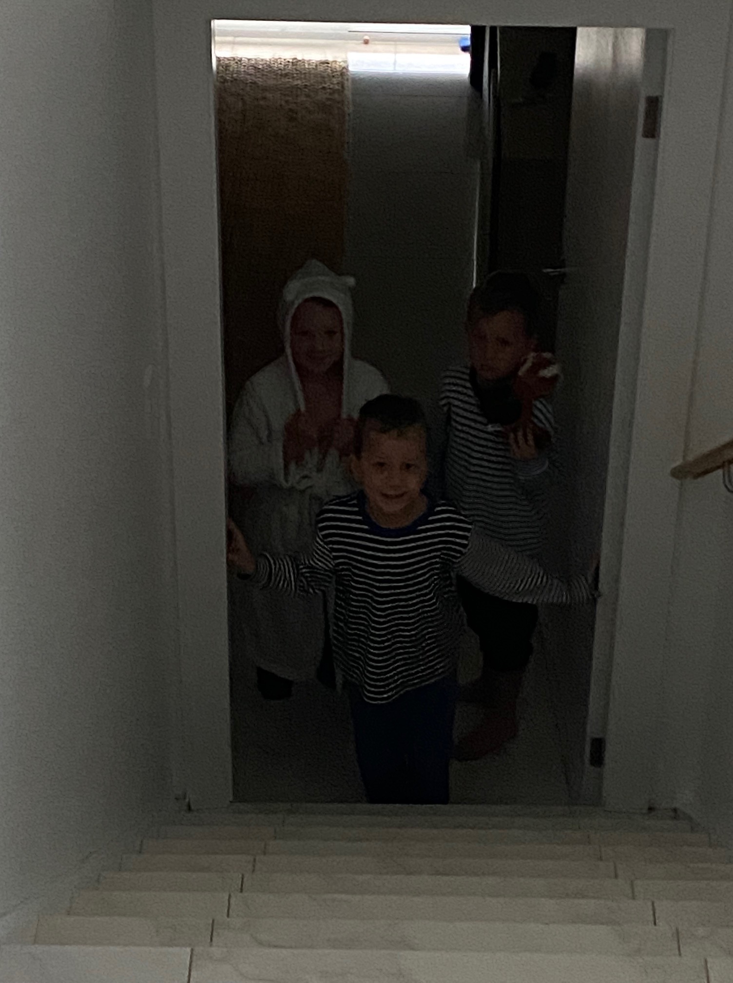 He sent a photo of the kids standing at the bottom of the stairs yesterday morning with the explanation: “All refusing to come up because we told them whoever wakes up and comes up last in the morning gets first turn of the tiger.”