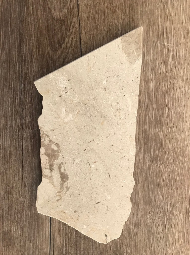 Oh did I show you the flooring I’ve chosen? Here is a pic of a sample, together with a piece of the travertine that’s in the apartment’s hallway and bathrooms.