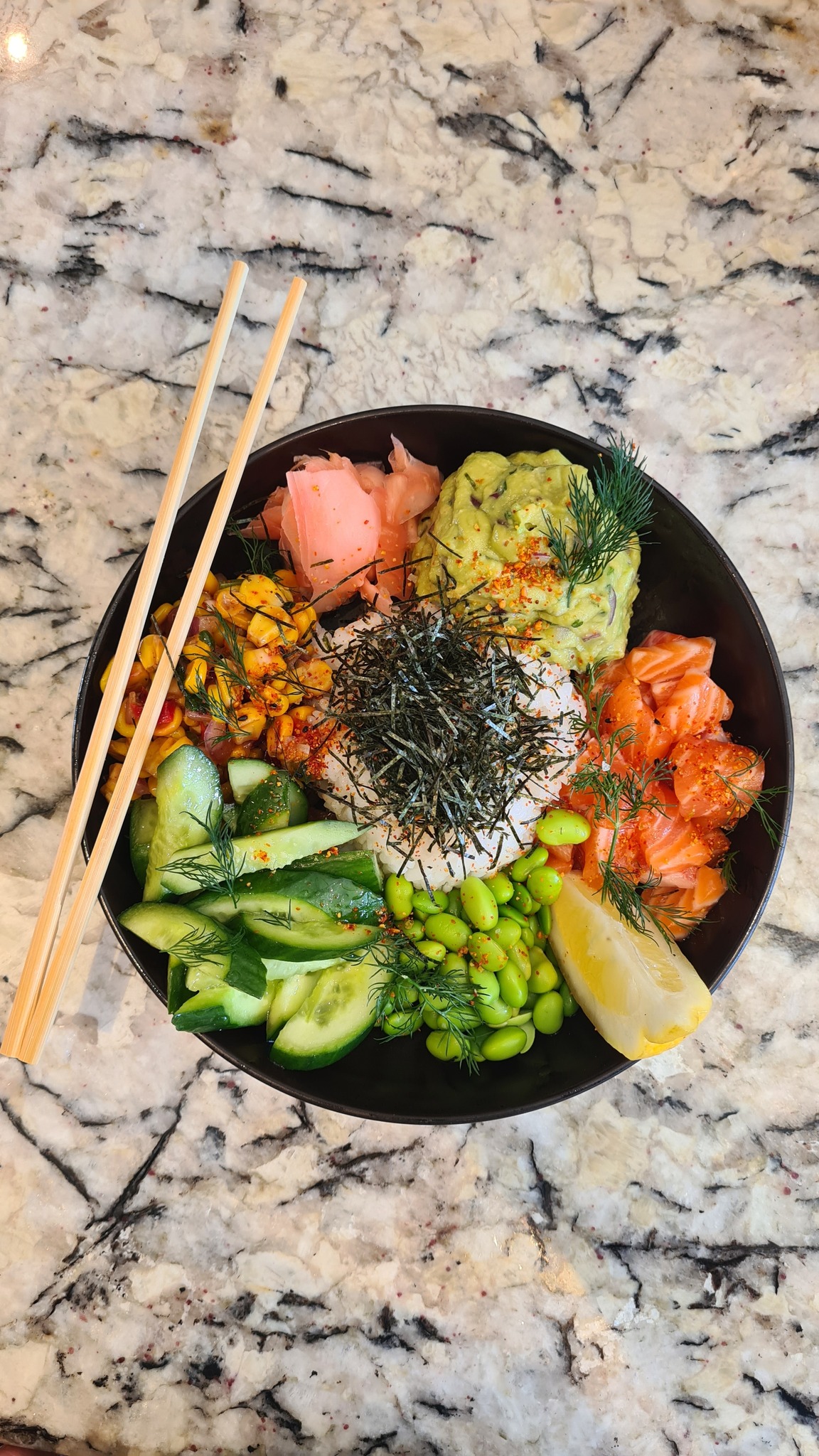 I had the poke bowl, which was very yummy and would have been a relatively healthy choice if I hadn’t eaten a slice of the youngest’s prawn pizza.