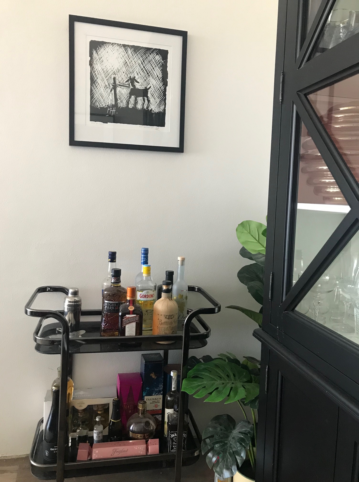 The collaged wall includes a lino cut that the eldest created in year 8. Seeing it alongside the other year 8 creations in an exhibition was one of those moments of clarity where you realise your child has proper artistic talent. It sits alongside a recycled artwork by the eldest that won an art prize, while the owl was created when the eldest was about seven years old.