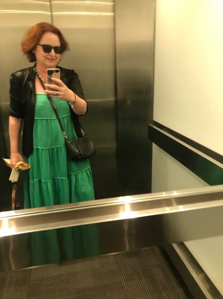 (I am wearing sunglasses in the lift to hide my eye wrinkles for the selfie. Vanity is a curse.)