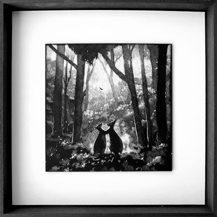 And here’s how the gallery describes Michele: “Born into an artistic Swiss-German family in 1972, Heibel spent most of her childhood years in Switzerland’s Bernese countryside. In 1983, after extensive travels, her family made the decision to settle permanently in Australia. She attained her Diploma of Graphic Design at North Sydney’s Billy Blue School of Graphic Arts in 1991 and worked as a designer for the following eighteen years. Now based in the Hunter region, Heibel has returned to her artistic roots and that familiar rural lifestyle, where she creates delicate artworks on black clayboard using only a pin. Her award-winning works possess a whimsical quality that often belie the serious message within”