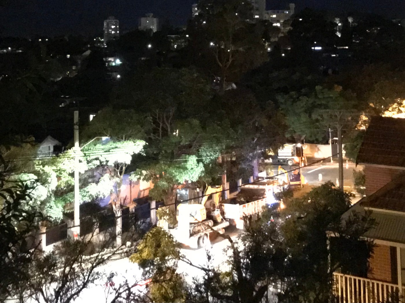 Last night the roadworks returned. The concrete saws got another workout and three diggers excavated the nature strips. Five hundred million lights flashed.