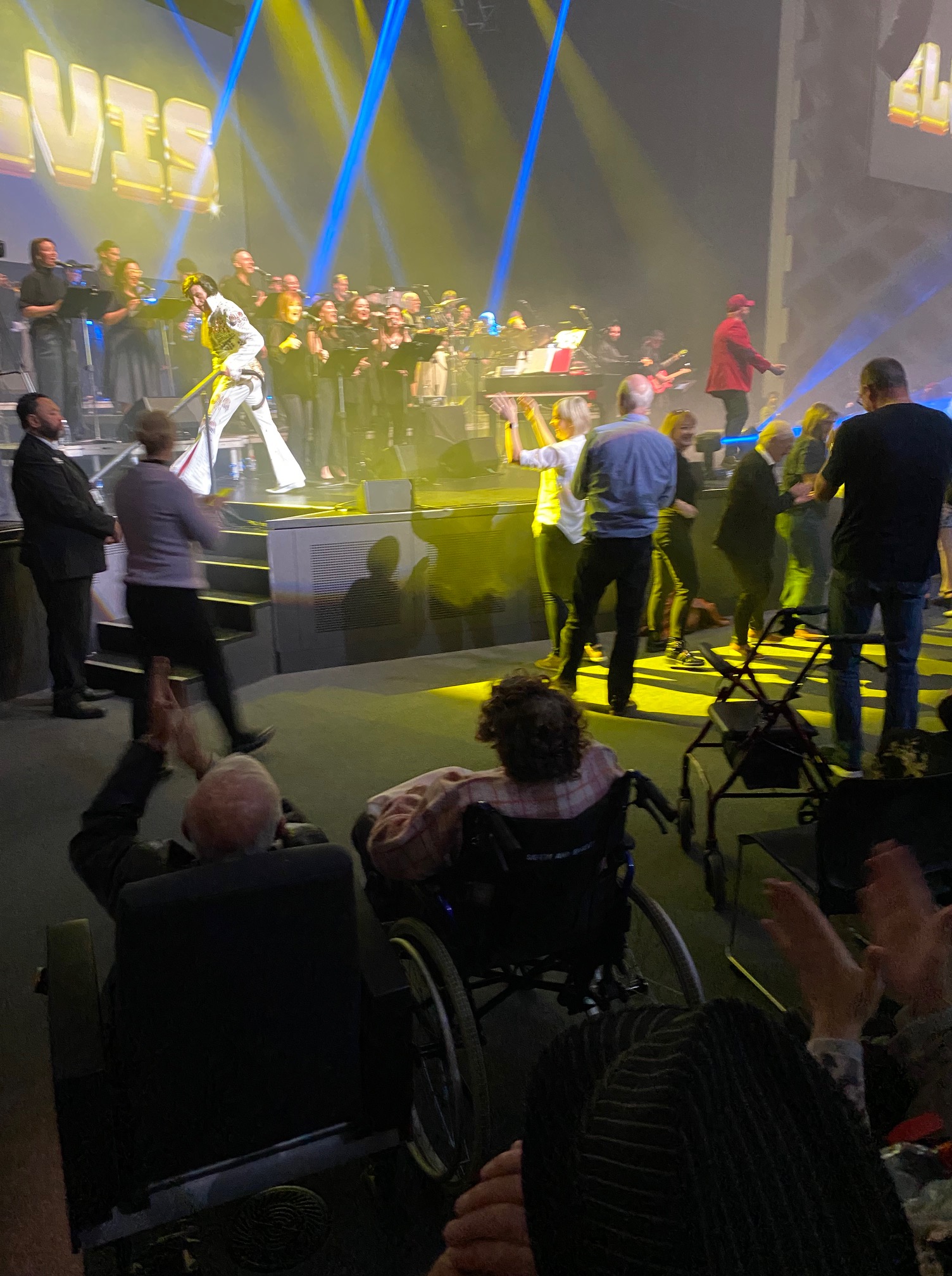The largest group of performers that Elvis ever shared a stage with was 47 musicians and singers. This show featured over 100 musicians and singers on stage … and an impressive number of elderly people in wheelchairs in the front row. Nathan reckons we were the youngest people in the room, which is saying something when two of us are the wrong side of 55.
