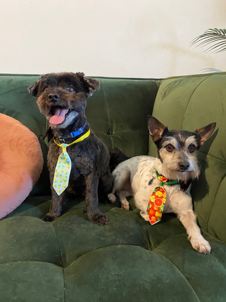 Speaking of the couch … don’t the doggos look cute sitting on it after their haircuts, wearing their ties …
