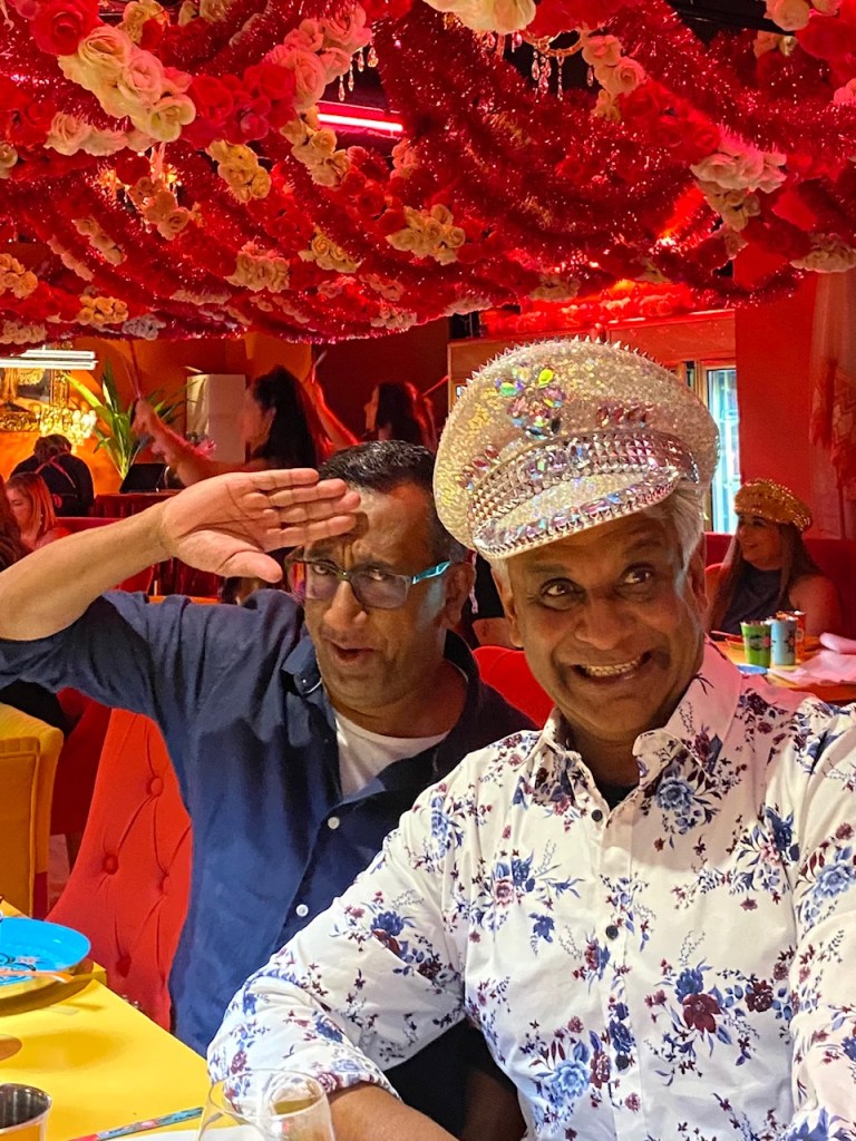 It was WILD. It has a Bollywood theme, with pink walls and garlands hanging from the ceiling and loud 80s music and women dancing among the tables.