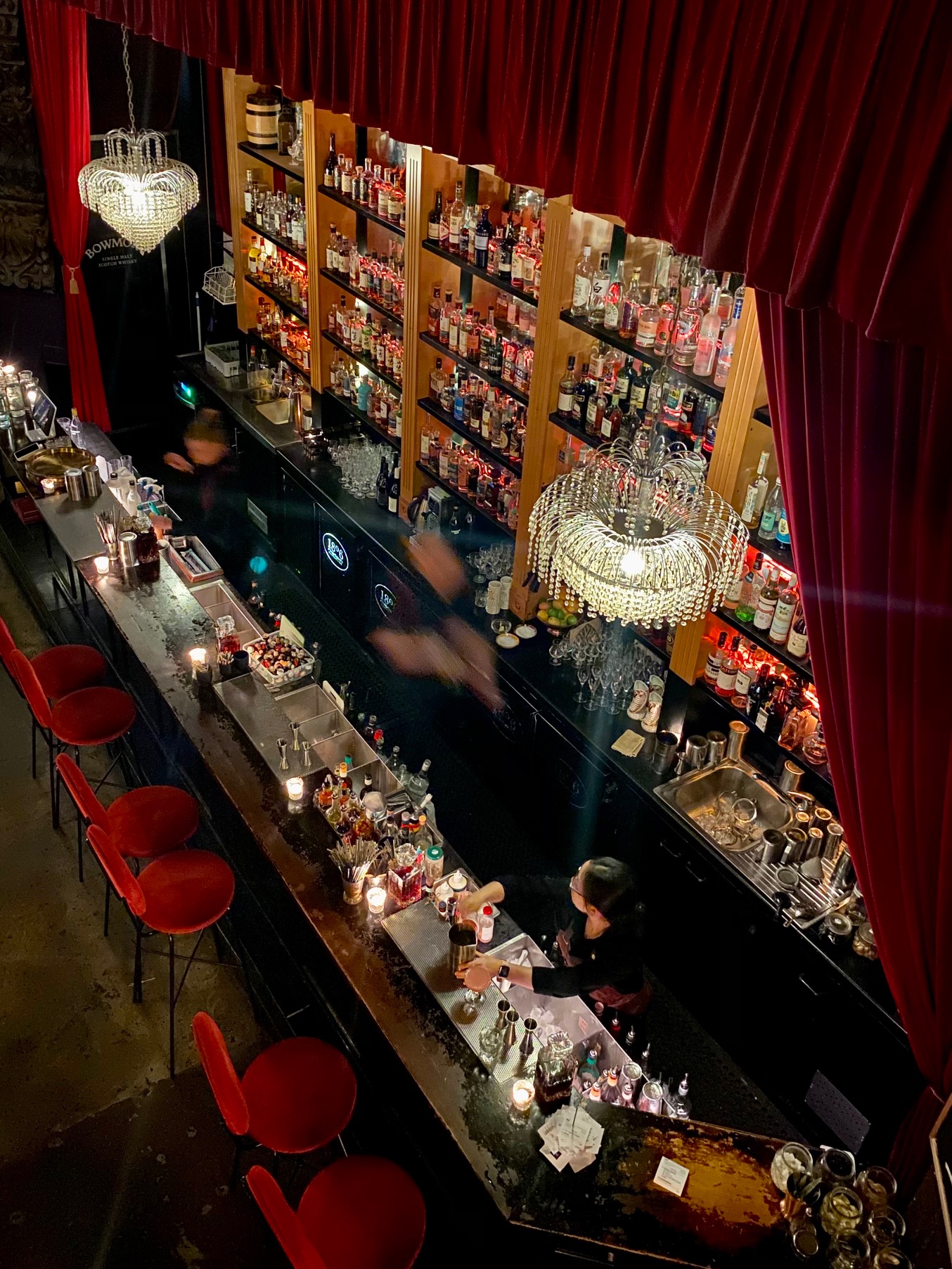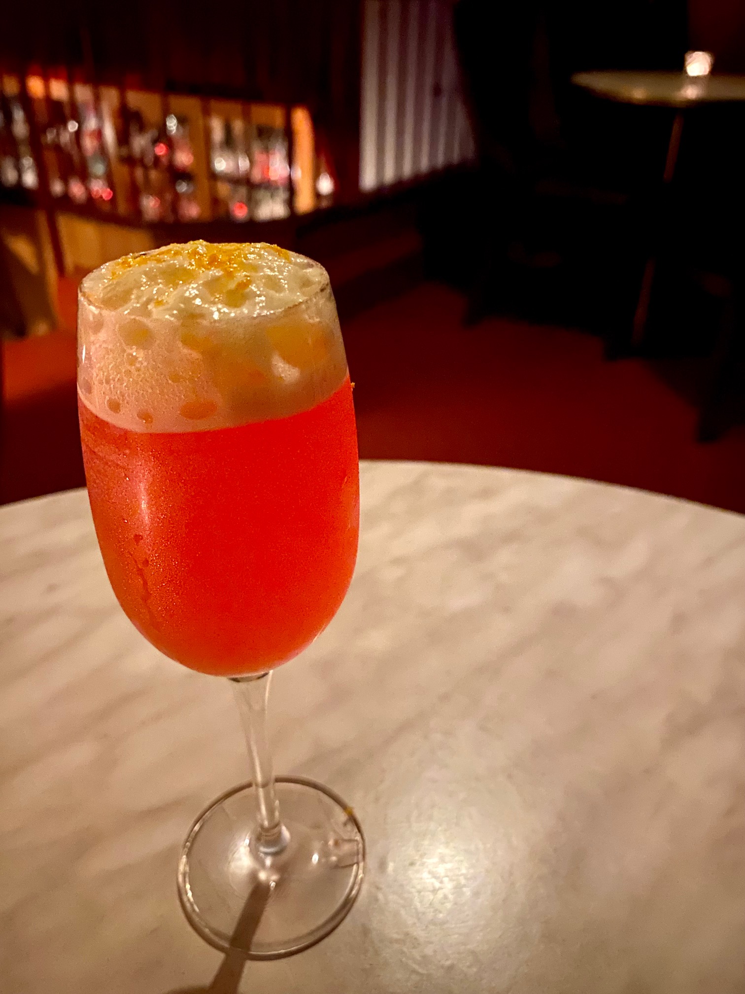 The stage has been turned into a bar, but the viewing mezzanine remains and we settled into comfy velvet armchairs for a couple of 7th Time’s a Charm cocktails – gin, limoncello, French sparkling, strawberry, lemon and orange foam. Delicious!