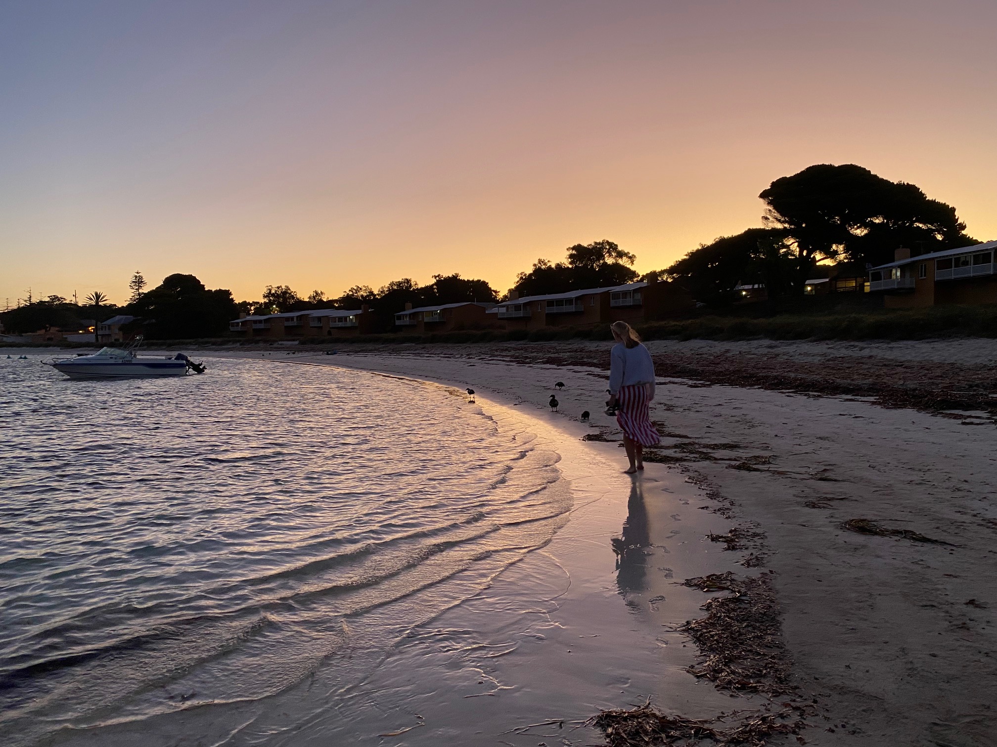 Our goal was to watch the sunset, so we went for a dip in the sparkling water, then settled into the beachside bar for an Aperol Spritz for me and the most delicious mocktail for the youngest. Then we shared a serve of buffalo wings, carefully protecting them from the seagulls, who are terrors. We watched one steal a man’s $48 steak when he took his eyes off it for a split second.