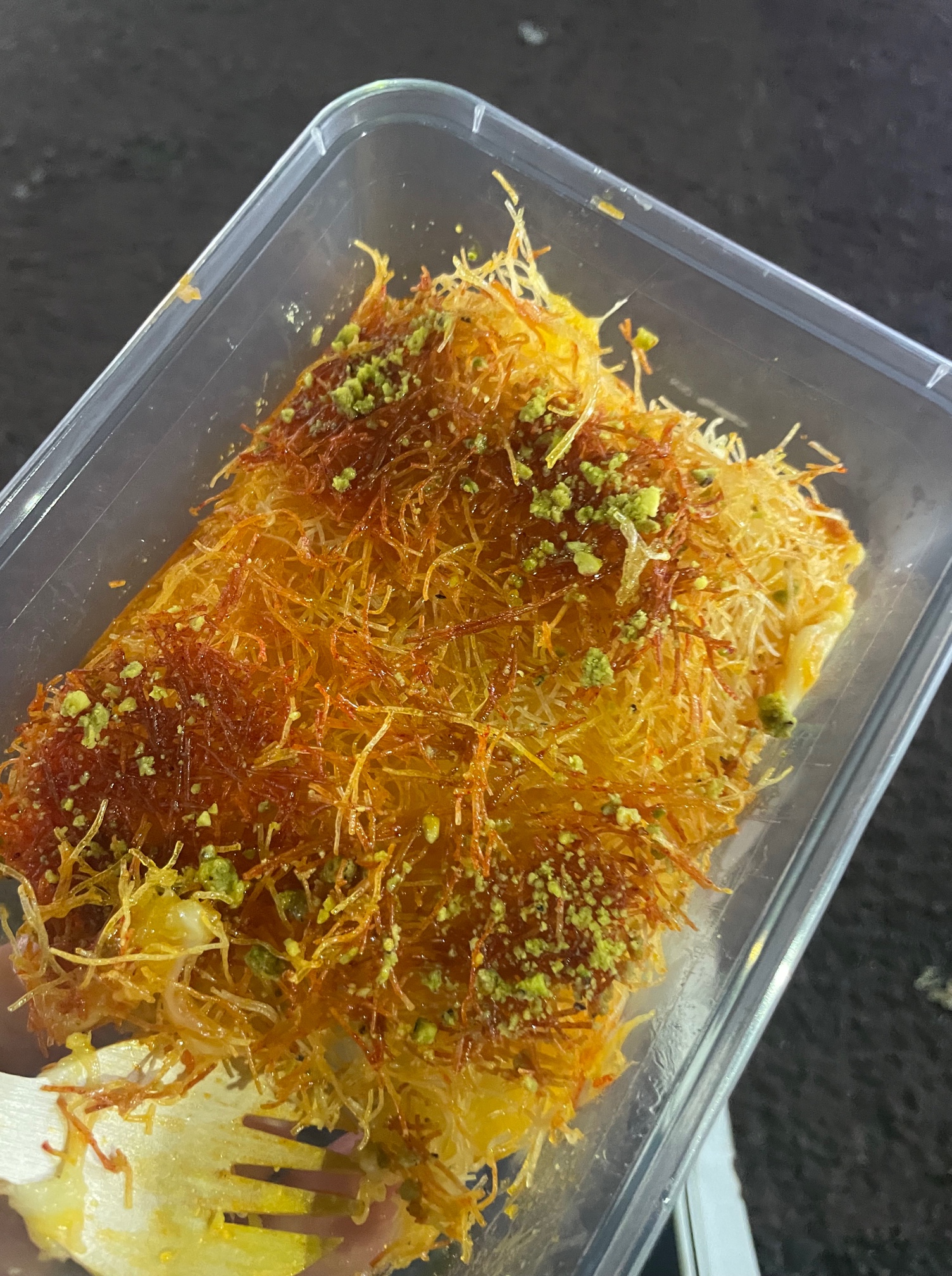 It’s a traditional Arabic dessert, made with spun pastry called kataifi, soaked in a sweet, sugar-based syrup and he said it was yum.