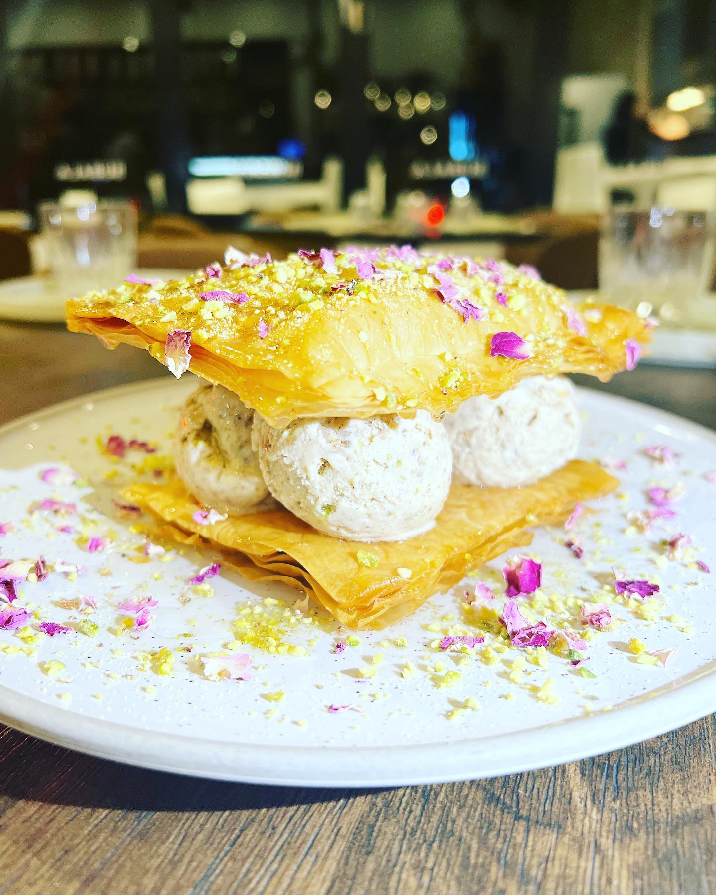We ate fabulous dips; friend cauliflower with sesame, tahini sauce and salt bush; oven baked chicken with middle eastern spices, caramelised Spanish onion, pine nuts, herbed labneh and black olive crumb; slow-roasted lamb shoulder; and baklava ice cream sandwich. Wow!