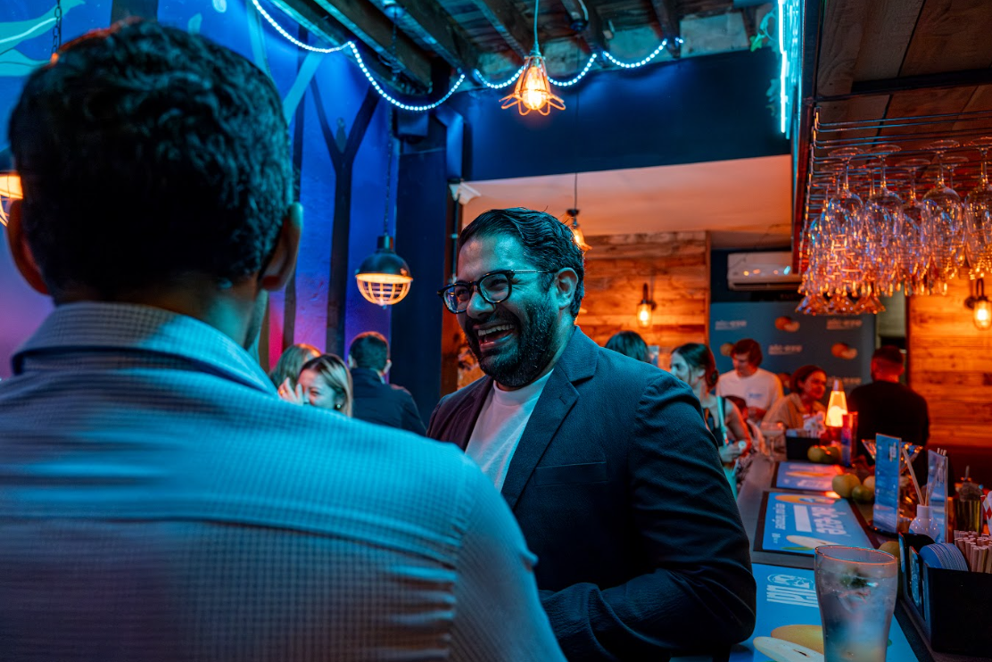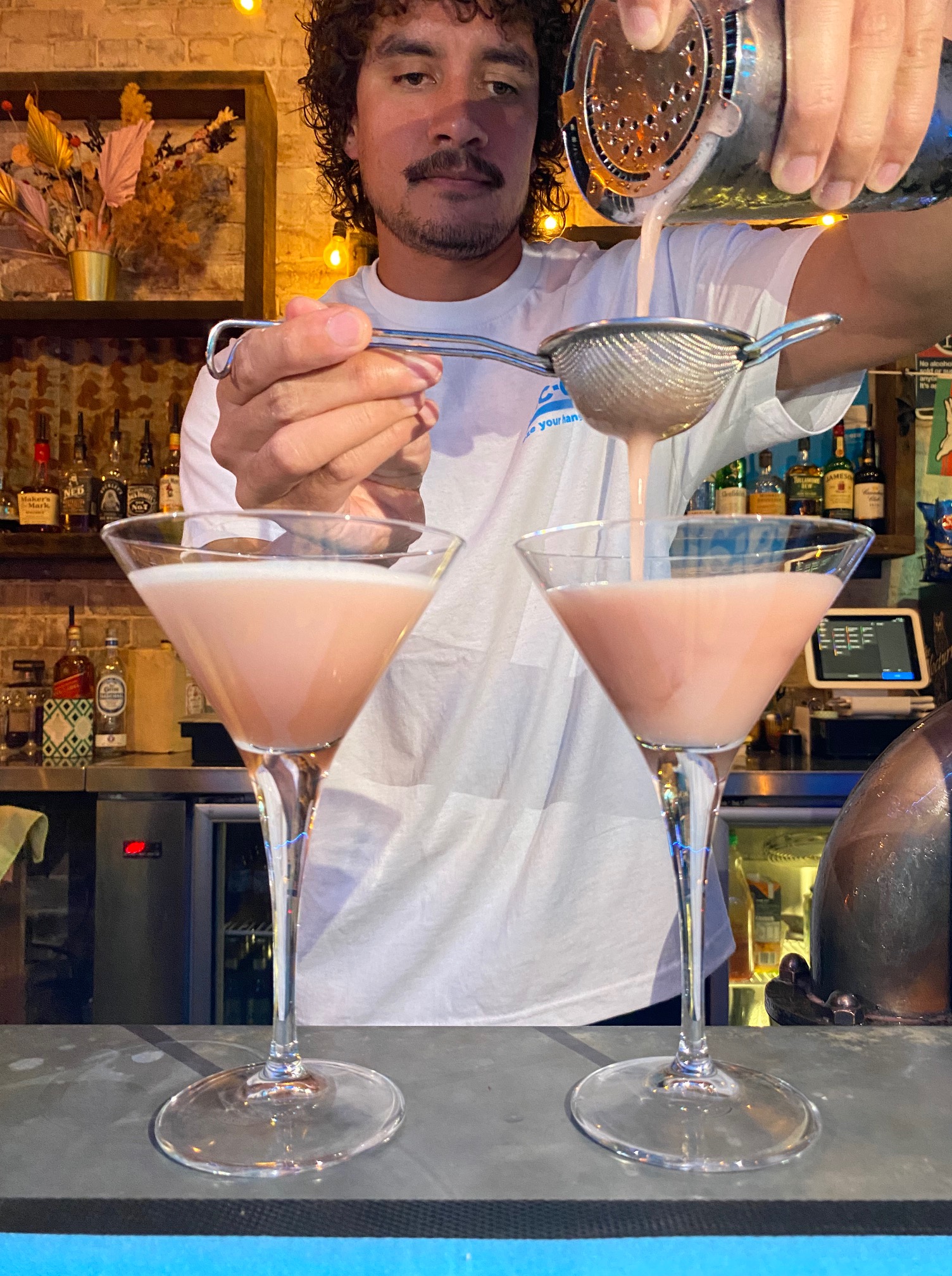 We gamely swallowed the recommended dose of three large alc-eze tablets and launched ourselves into the cocktail list to put them to the test. (That’s me down the back talking to one of the founders.)