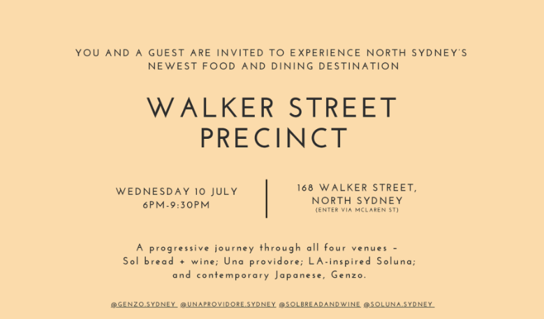 The Walker Street precinct, for example, includes artisanal providore Una; Sol bread and wine; LA-inspired, relaxed dining, bar and lounge Soluna; and a contemporary Japanese dining venue called Genzo.
