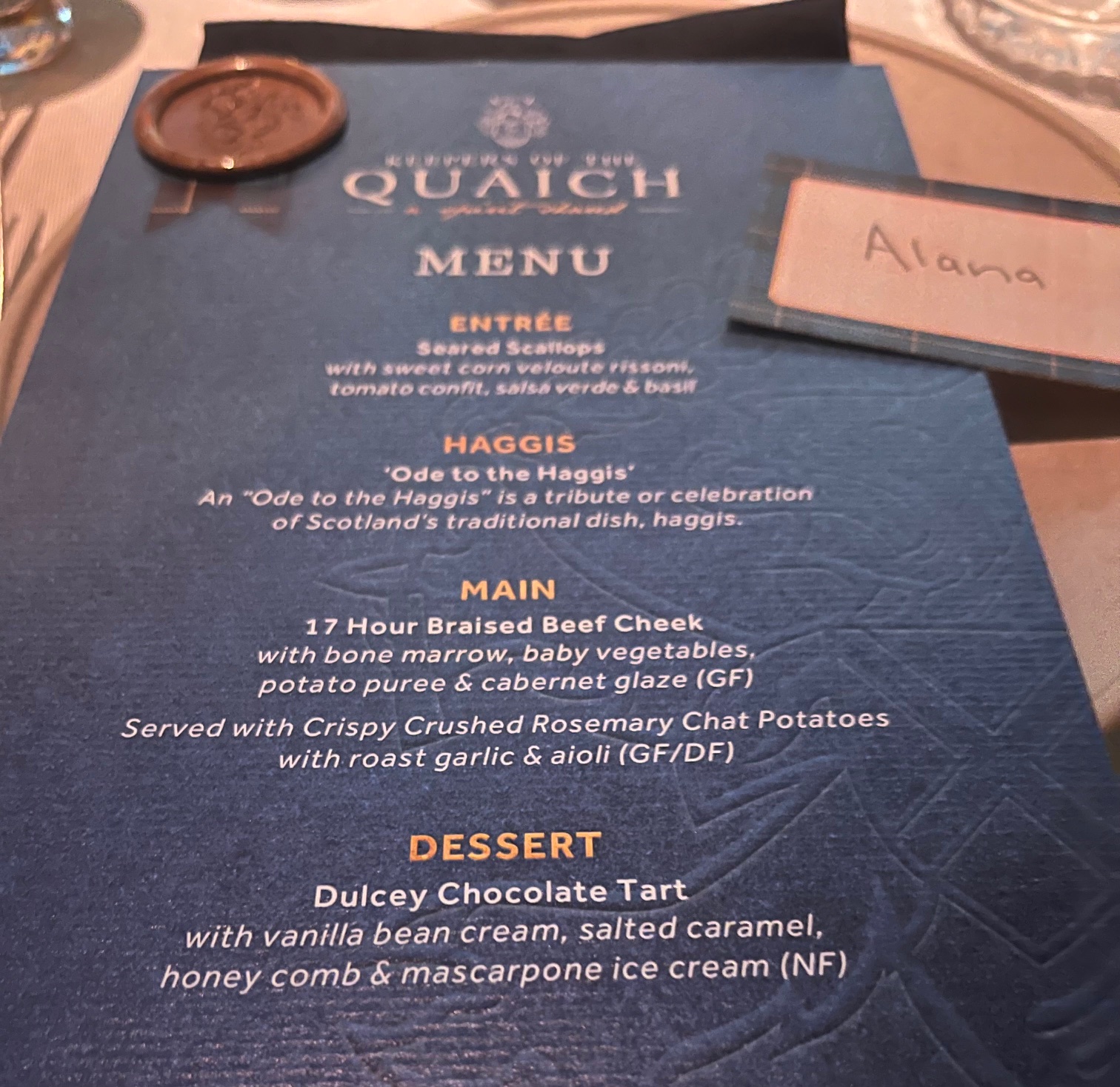 A haggis was also ceremonially presented, but I wasn’t game enough to try it, especially since it was stone cold by the time the log landed at our table.