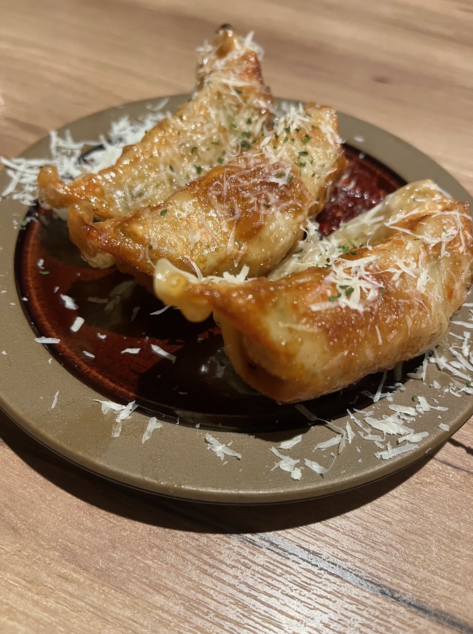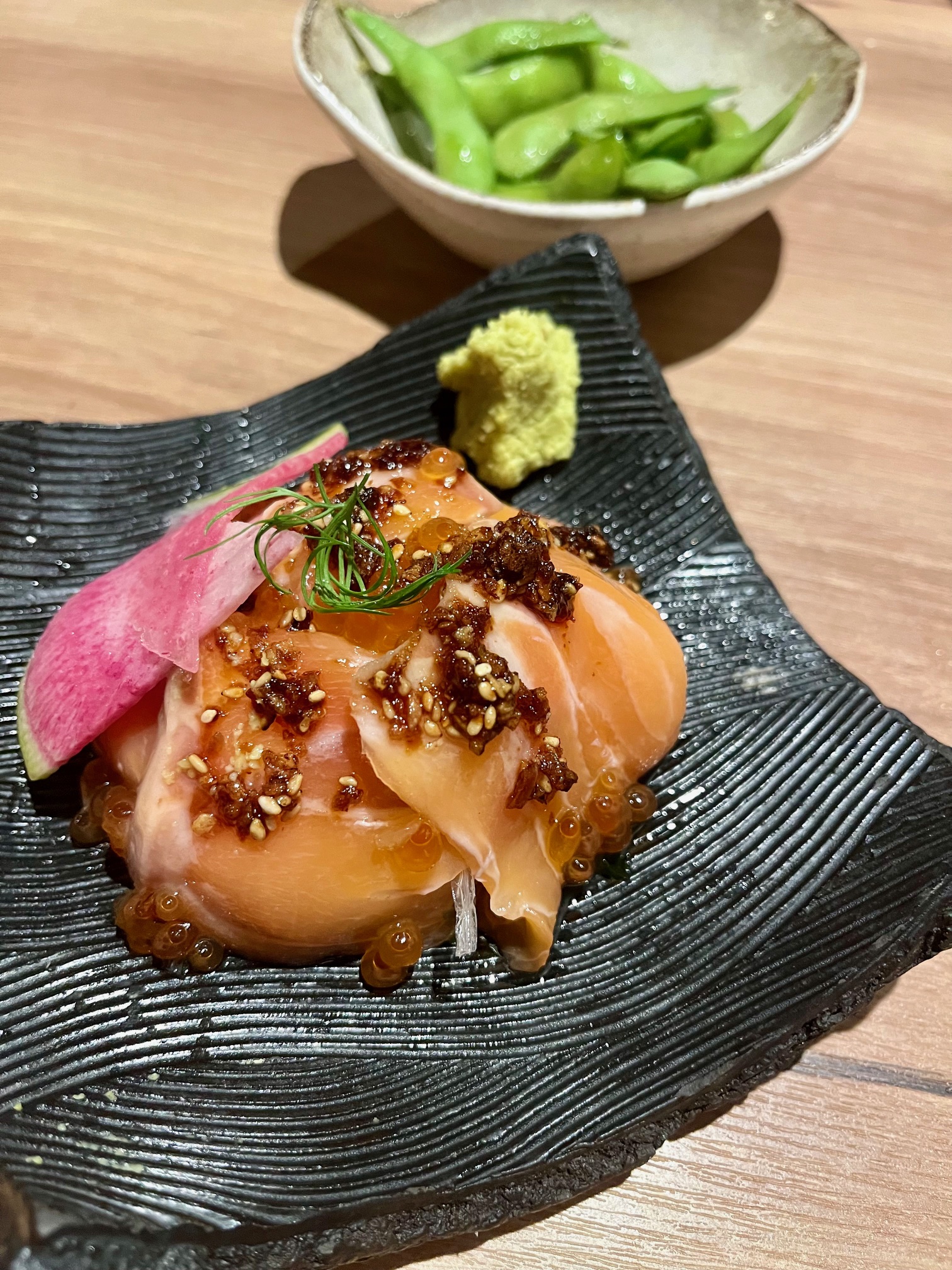 Afterwards we headed across the canal for dinner in a yakitori restaurant for dinner, which included the requisite meat on a stick, alongside pork dumplings sprinkled with parmesan and sashimi with crunchy chilli and soy sauce drizzled over it.