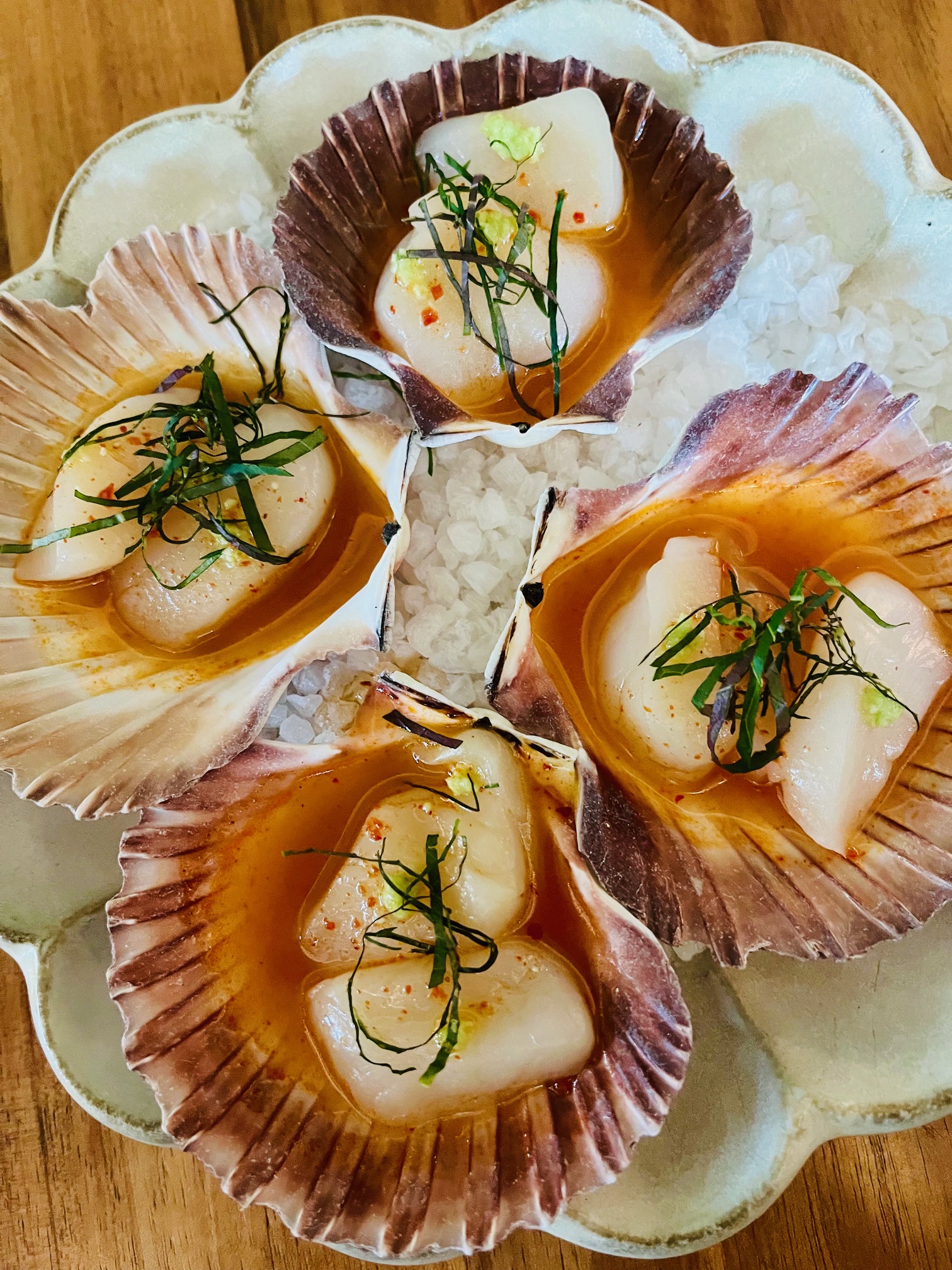 I was particularly enamoured with the snacks – the royal red prawn and nori rolls were to die for. They didn’t photograph well, they just looked like little fried logs, so I’ll dazzle you with pics of the salmon and the scallops instead …