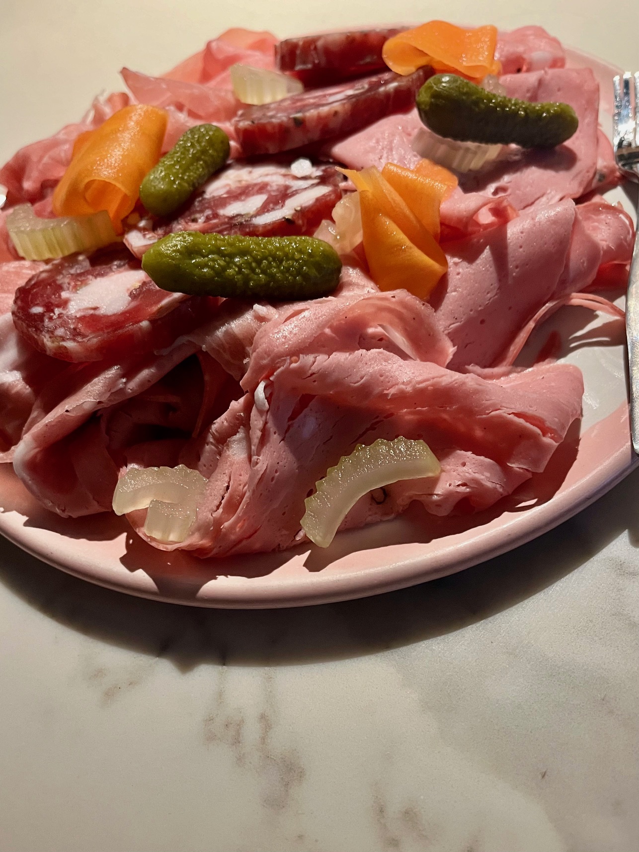 We tried the Mini Lobster Roll on brioche with spicy mayo and chives; the Kingfish Tartare with goat curd, lemon gel, kombu dressing, pickled qukes and green oil; the Charcuterie plate with homemade pickles; and a mystery potato scallop thingie.