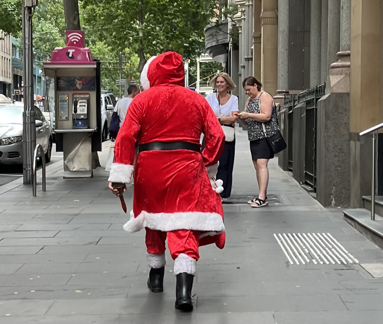 I was too shy to ask for a selfie, as Santa was off to do important Christmas business, so you’ll have to make do with the pic of him striding off up Collins Street.