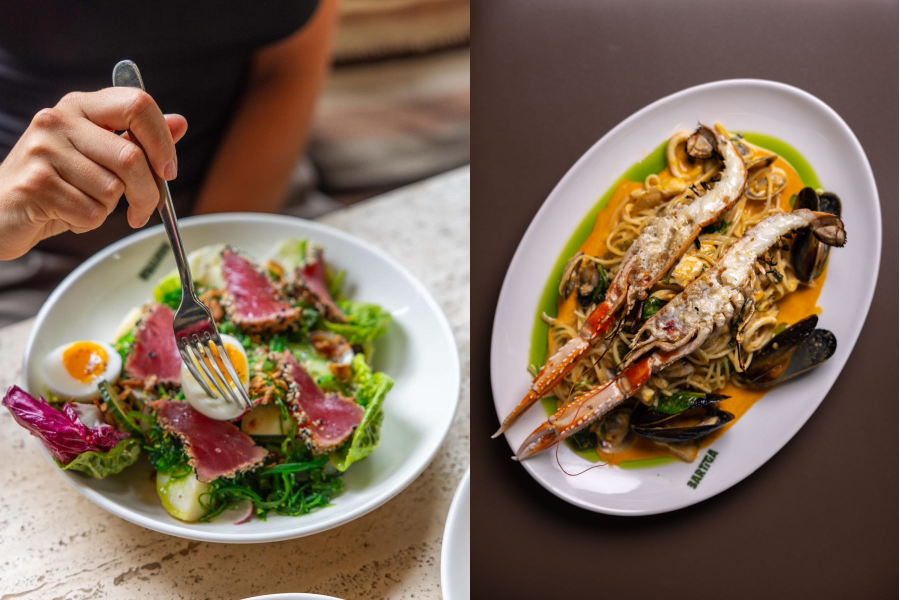 We were dazzled and sated, but we couldn’t help trying the Tom Yum Boullabaisse Spaghettini with mussels clams, white fish and grilled scampi; plus a Japanese Nicoise with seared crusted yellowfin tuna, baby cos, green beans, soft boiled egg, baby chat potatoes, red radish and roasted sesame wakame, furukake and ponzu dressing.