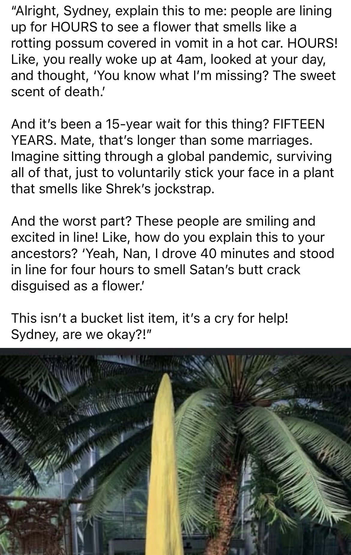 Botanic Gardens of Sydney’s social feed was chockablock with updates during the countdown to Putricia blooming and there was even a livestream of her unfurling to satisfy demand from fans.