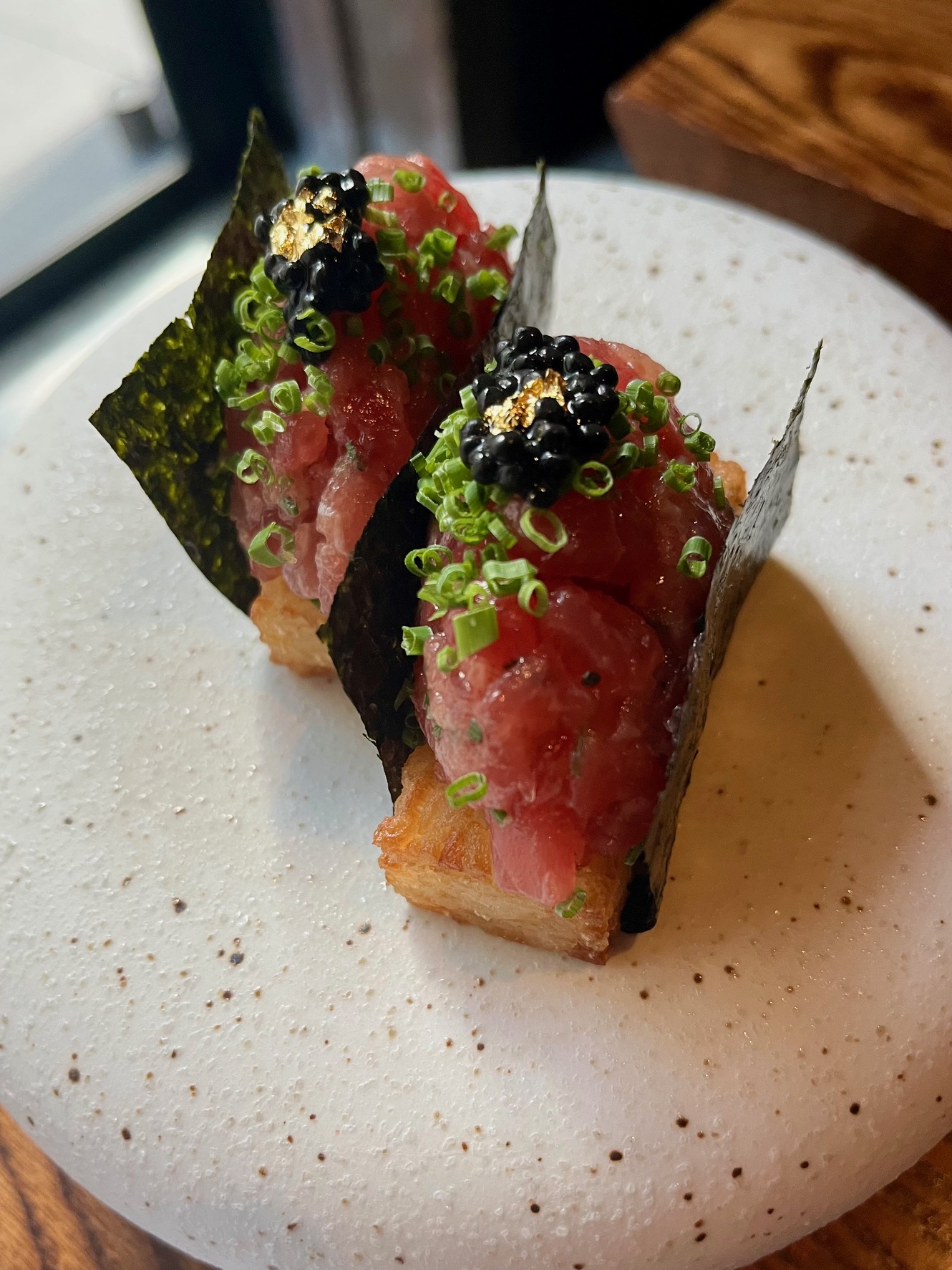 Menu highlights included: Sansho gravlax with potato aioli and rice puff; Beef tartare with confit yolk emulsion, hazelnut and rice cracker; Tuna tartare with yuzu kosho, crisky sushi rice and avurga; and toothfish fillet with koji marinade, sumiso and cavolo nero.